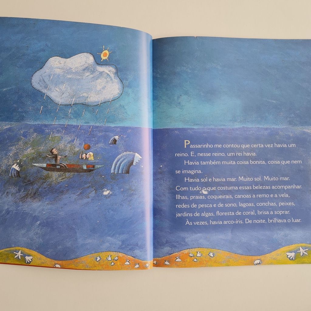 Passarinho me contou que certa vez havia um reino. E, nesse reino, um rei havia. Havia também muita coisa bonita, coisa que nem se imagina. Havia sol e havia mar. Muito sol. Muito mar. Assim começa mais uma história criada por Ana Maria Machado, em que um rei acreditava que seu país era deslumbrante, perfeito, um verdadeiro paraíso para se viver. Por isso, ele se surpreendeu quando um viajante muito idoso o procurou para lhe dizer que no reino havia um problema. No entanto, o visitante morre antes de dizer qual era o problema. Para o rei, que não via nada de errado, porque vivia da imagem construída por ele e por aqueles que estavam acostumados com o lugar, descobrir tal problema seria uma tarefa quase impossível. Uma narrativa instigante que trata de forma sensível e lédica a questão do saber olhar, perceber o outro e o mundo a sua volta.