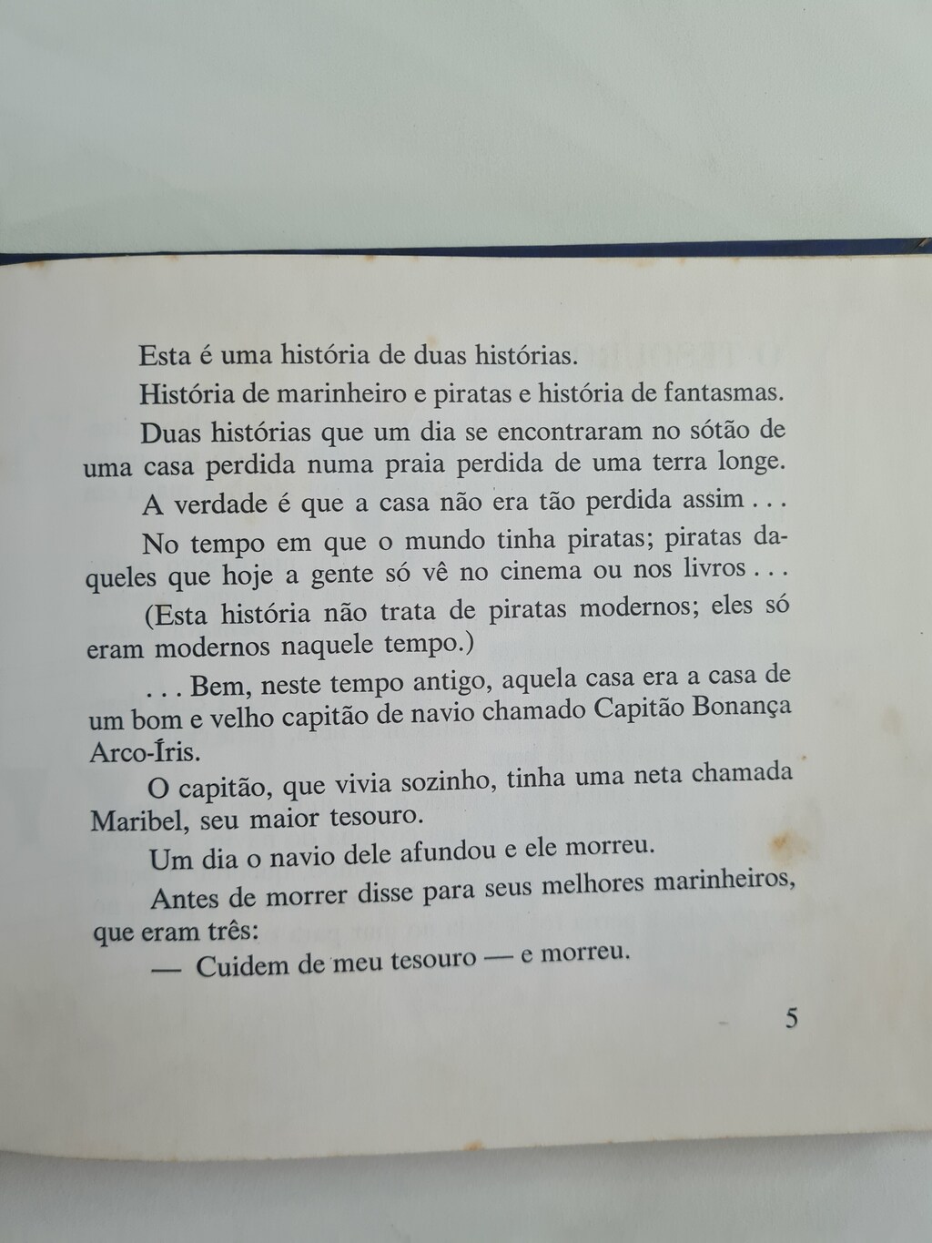 Esta é uma história de duas histórias. História de marinheiro e piratas e história de fantasmas. Duas histórias que um dia se encontram no sótão de uma casa perdida numa praia perdida de uma terra longe. A verdade é que a casa não era tão perdida assim… No tempo em que o mundo tinha piratas; piratas daqueles que hoje a gente só vê no cinema ou nos livros… (Esta história não trata de piratas modernos; eles só eram modernos naquele tempo.)