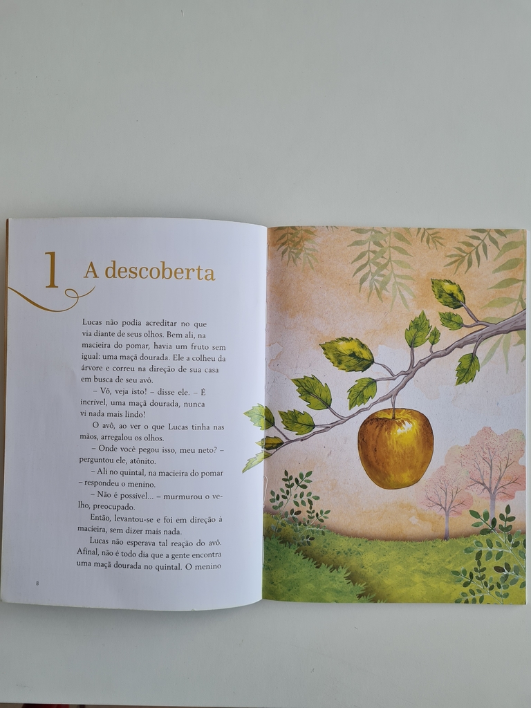 Lucas não podia acreditar no que via diante de seus olhos. Bem ali, na macieira do pomar, havia um fruto sem igual: uma maçã dourada. Ele a colheu da árvore e correu na direção de sua casa em busca de seu avô. O avô, ao ver o que Lucas tinha nas mãos, arregalou os olhos e mudou de feição, imediatamente.