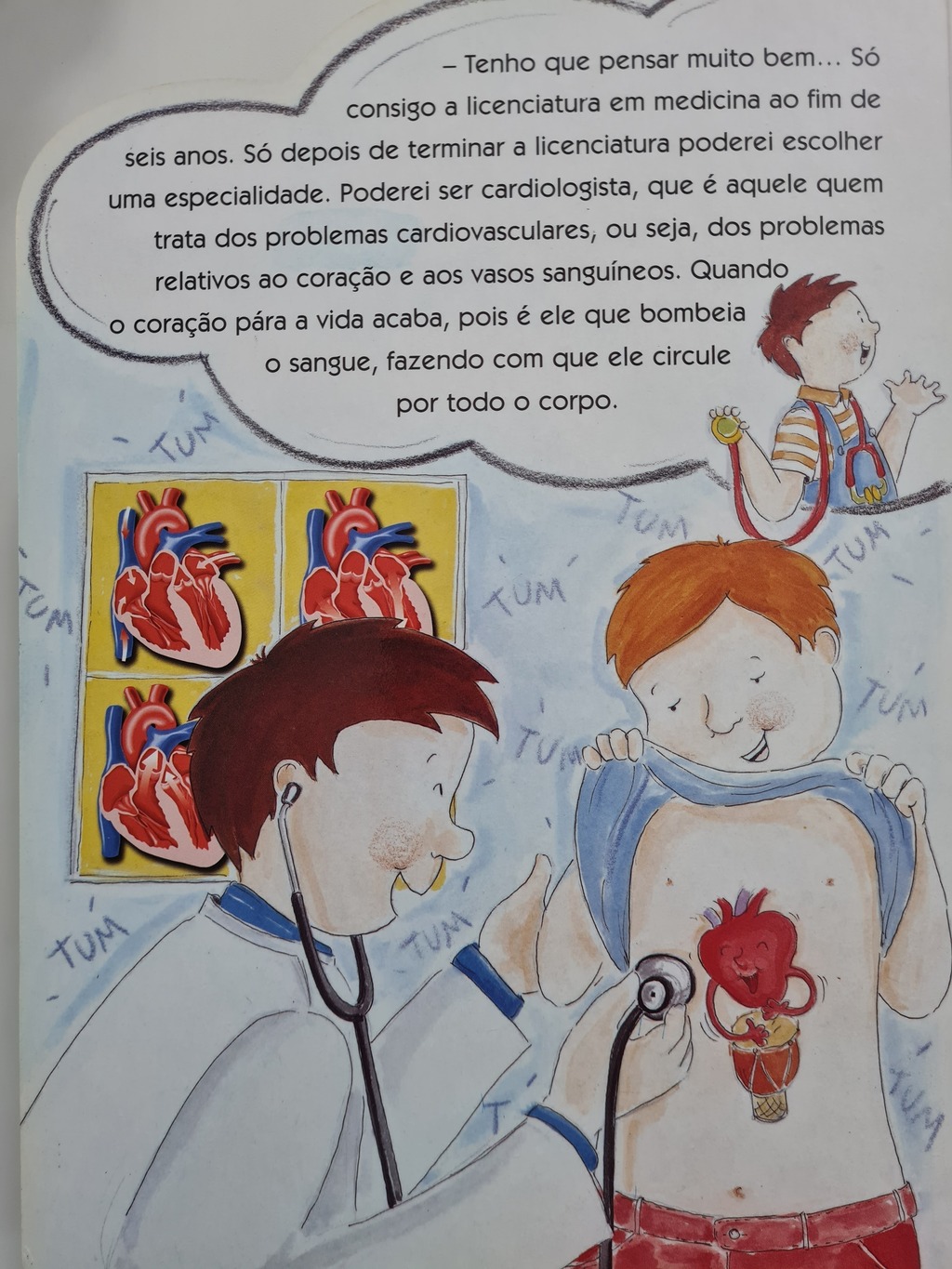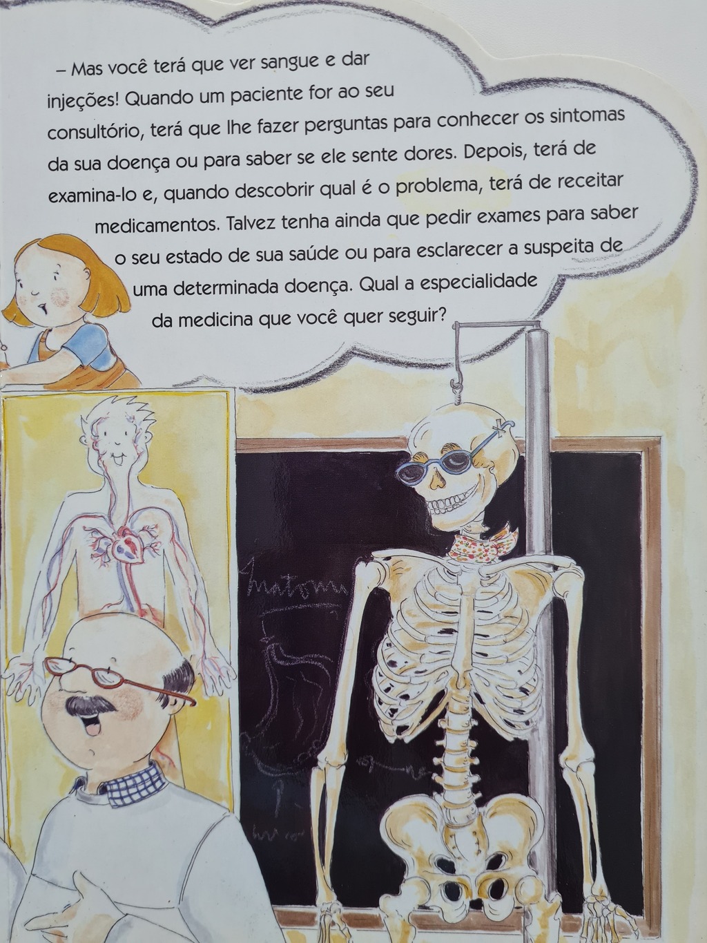 Vou usar estetoscópio, Bata branca, bisturi. E talvez um microscópio… Quero aprender a curar, A salvar, a socorrer, E, sobretudo, a dor aliviar.