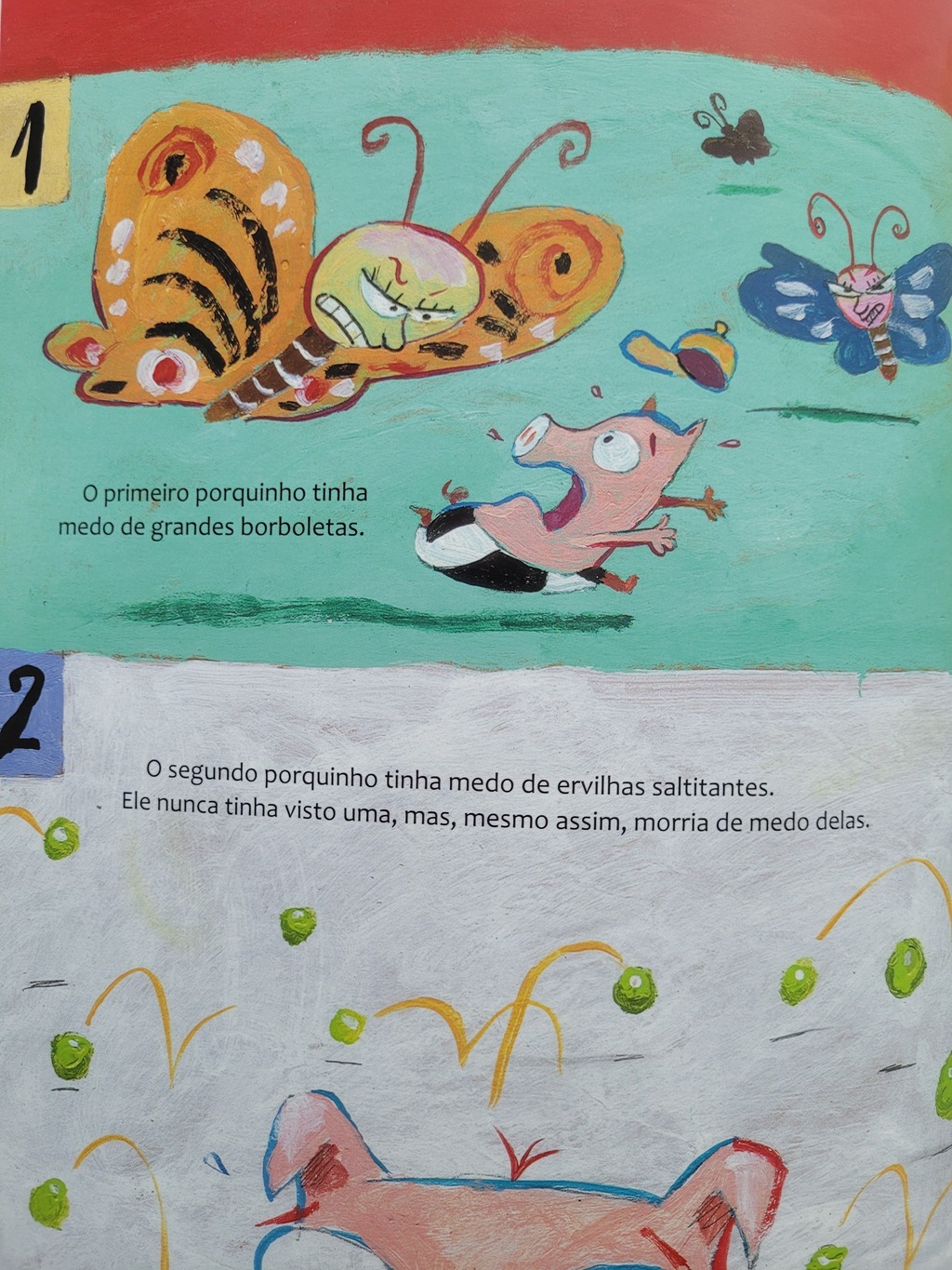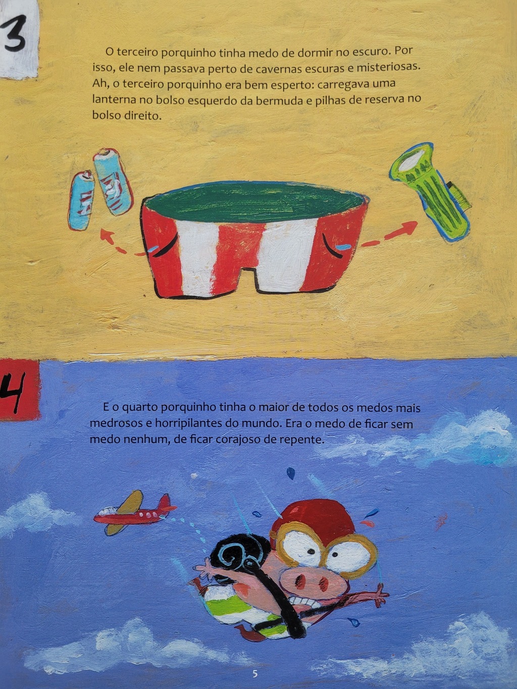 Era uma vez quatro porquinhos medrosos, um lobo valente e um livro em branco. O primeiro porquinho tinha medo de grandes borboletas. O segundo porquinho tinha medo de ervilhas saltitantes. O terceiro porquinho tinha medo de ficar no escuro. E o quarto porquinho tinha medo de ficar corajoso de repente. Mas e o lobo? Será que ele escondia algum medo embaixo de toda a sua valentia?
