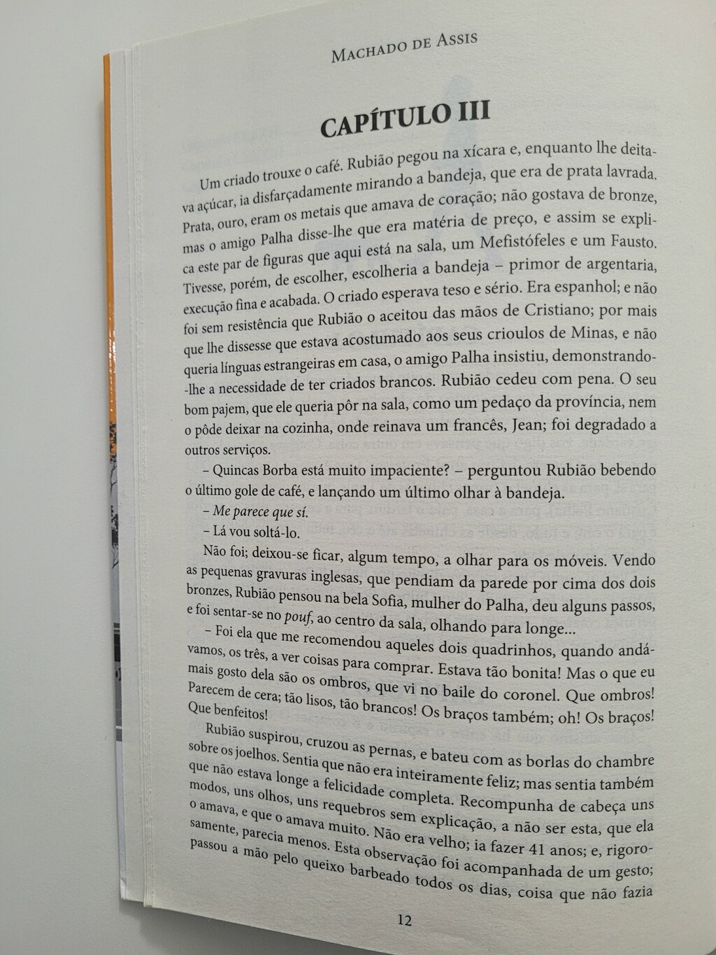 Rubião achou um rival no coração de Quincas Borba- um cão, um bonito cão, meio tamanho, pelo cor de chumbo, malhado de preto. Quincas Borba levava-o para toda parte, dormiam no mesmo quarto. De manhã, era o cão que acordava o senhor, trepando ao leito, onde trocavam as primeiras saudações. Uma das extravagancias do dono foi dar-lhe o seu própio nome; explicava-o por dois motivos, um doutrinário, outro particular.