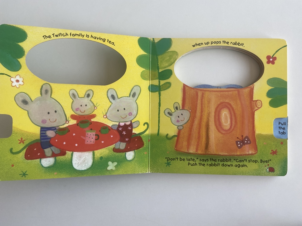 “Don’t be late!” urges the rabbit when it visits each of the woodland animals before running off again. “Late for what?” wonder the animals. What could the mystery surprise be? Push the rabbit all the way down, then pull the tab to see it pop up again!