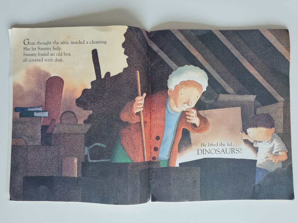 Sammy found na old box all covered with dust. He lifted the lid… Dinosaurs!