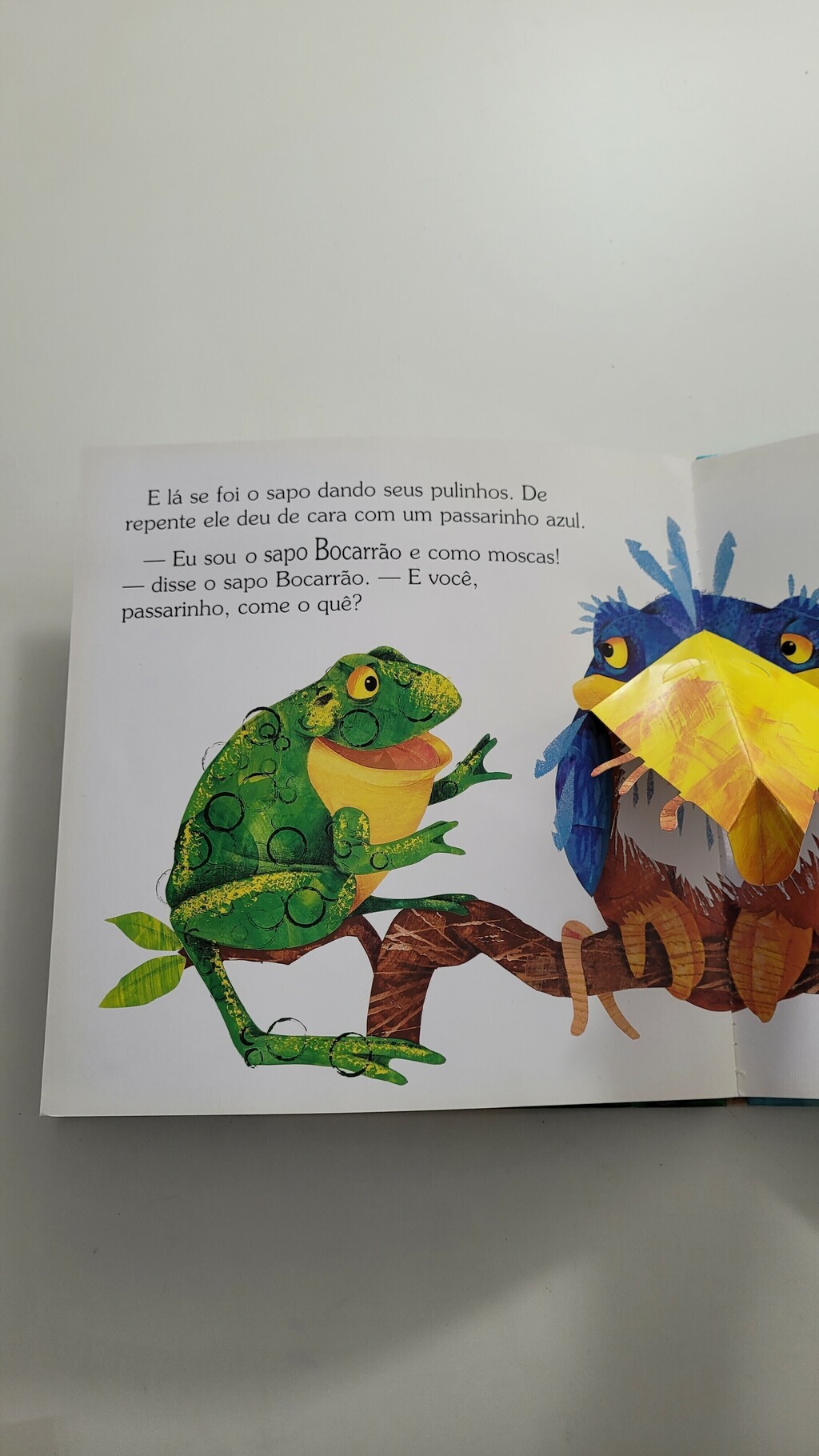 O sapo Bocarrão é um divertido animal que tem uma boca enorme, é muito guloso e vive perguntando aos outros bichos o que eles gostam de comer. Gordão, verdíssimo, de olhos arregalados, ele pula de página em página comendo moscas e jogando conversa fora até o momento em que encontra o terrível crocodilo com seus dentes brancos pontudos – e aí tem que tomar uma atitude radical. De produção esmerada, este livro tem dobraduras-surpresa em todas as páginas, brincadeiras gráficas e cores vibrantes, bem como letras graúdas para facilitar a leitura das crianças recém-alfabetizadas.