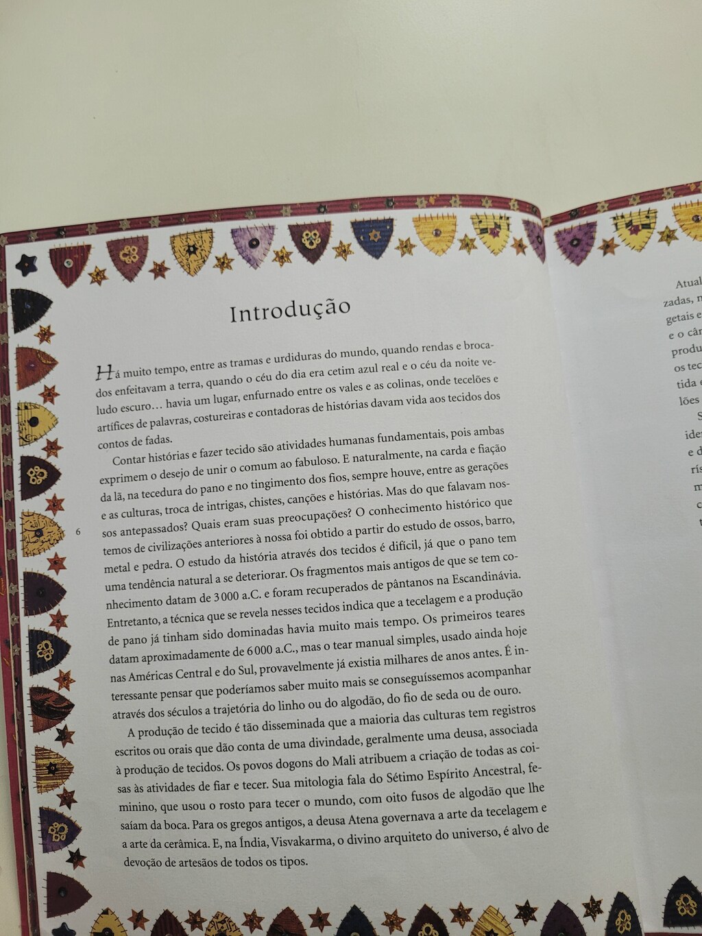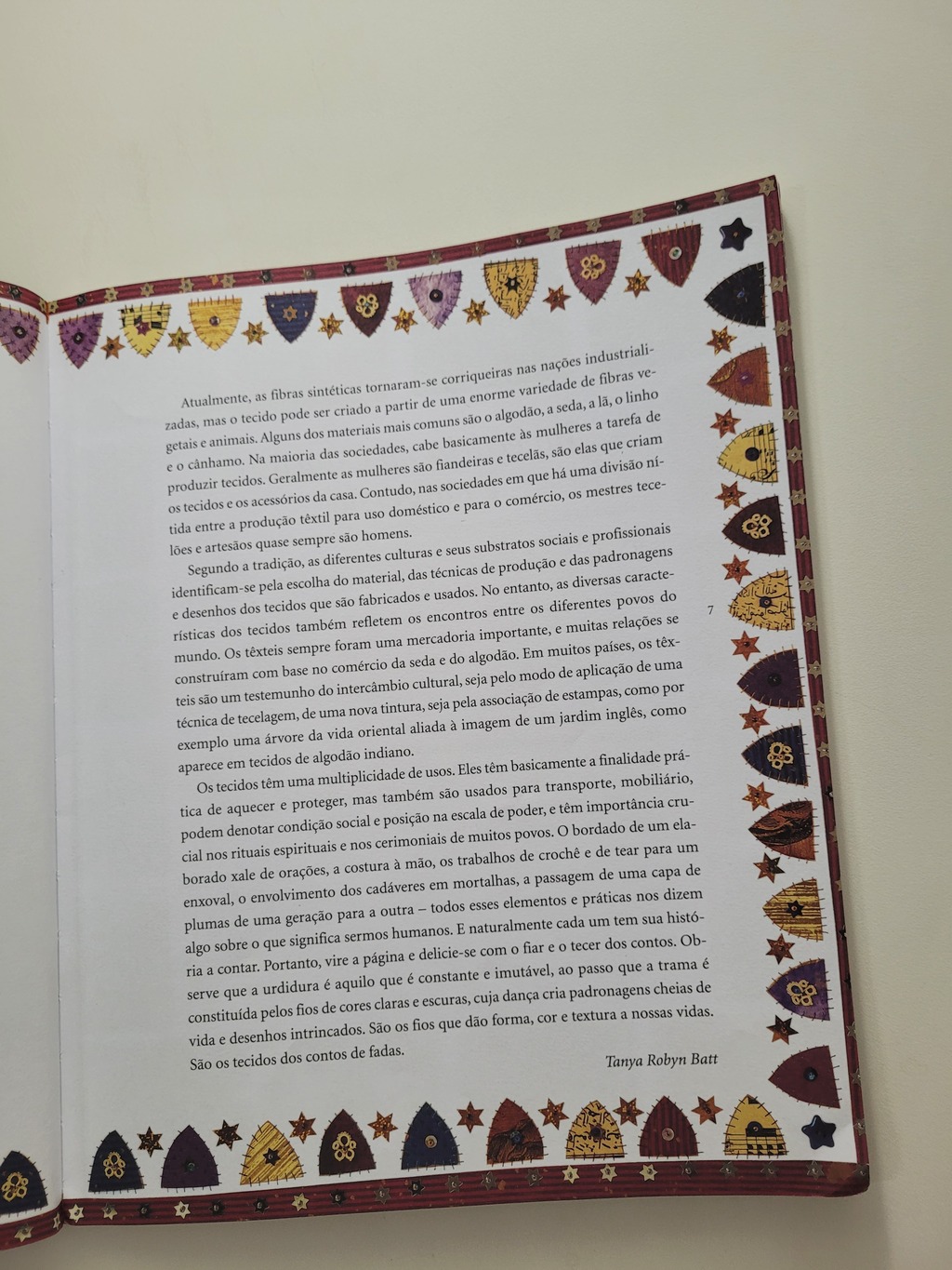 Este livro surpreendente nos traz a história de alguns dos mais encantadores tecidos produzidos através dos tempos por comunidades próximas e distantes. E cada um desses tecidos é protagonista de um conto. Desde os humildes farrapos do pobre até as vestes suntuosas do rei, desde o linho comum até o tecido mágico secretado por uma serpente de sete cabeças, tudo nos fala dos intrincados caminhos que se entrelaçam e formam a trama e a urdidura do tecido da vida.