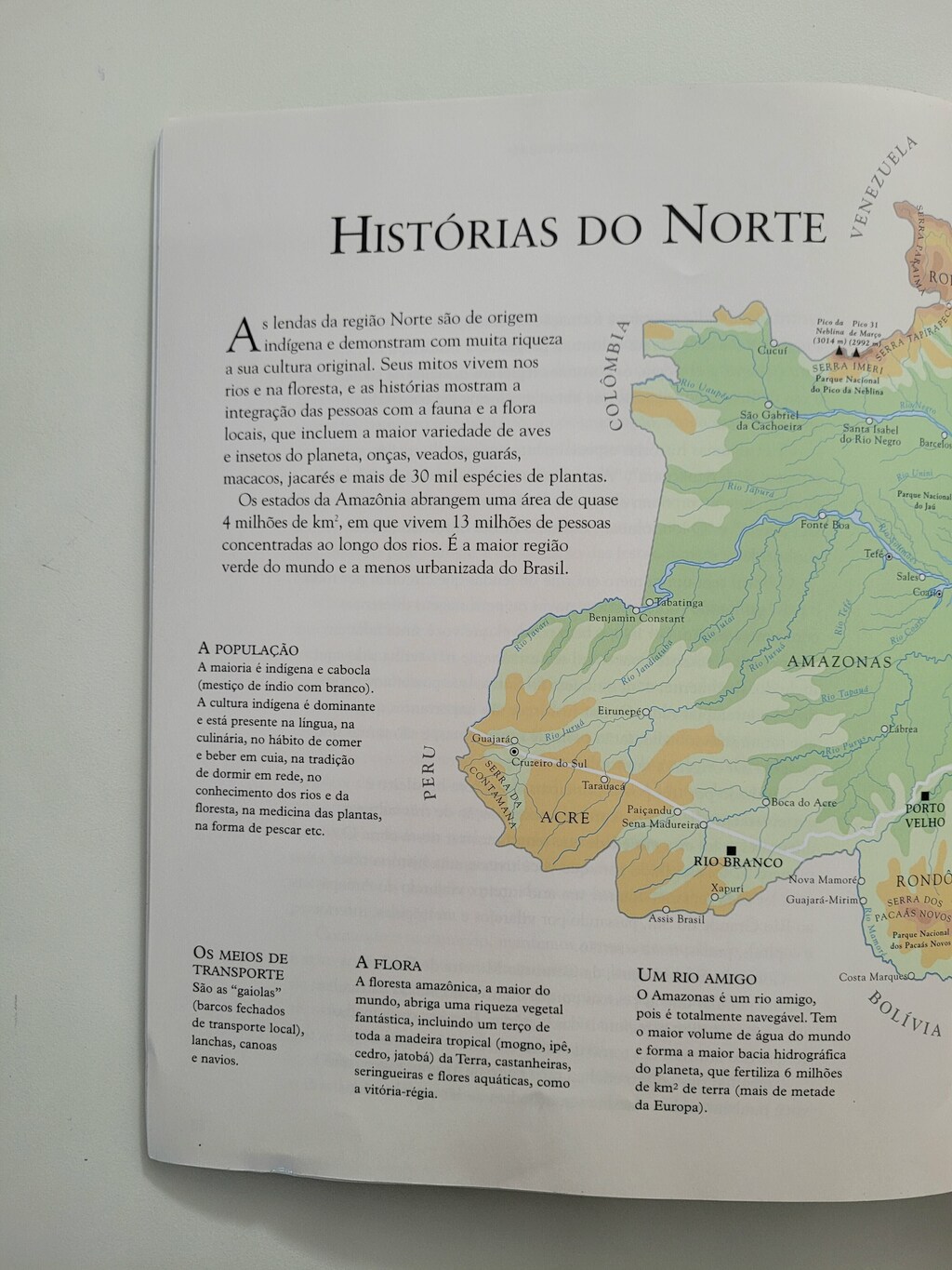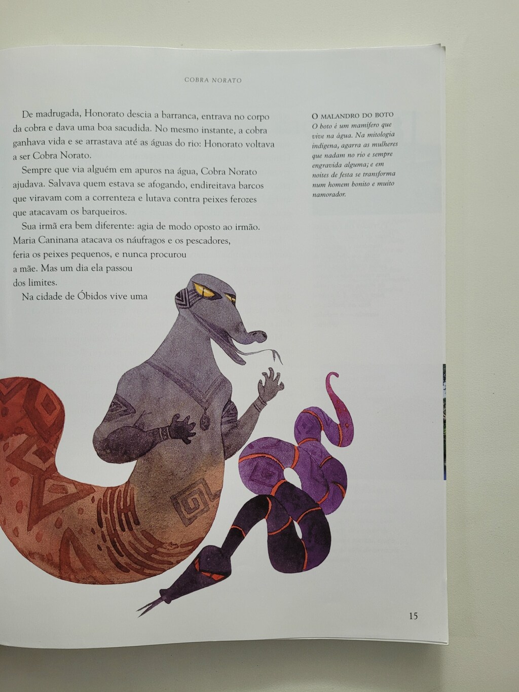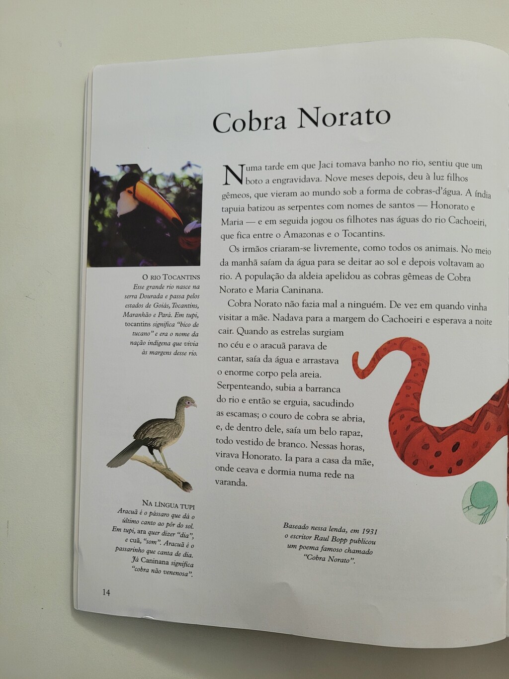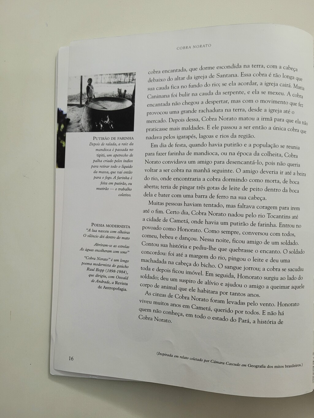 “O folclore, ou a cultura popular, é um dos modos de expressão que melhor refletem o pensamento, o sentimento e a atuação de um povo. Transmitido oralmente de geração a geração, ele ajuda a compor a memória da nação, e é a memória que nos dá consciência e auto-estima.” Silvana Salerno inicia dessa maneira a apresentação de Viagem pelo Brasil em 52 histórias, volume que reúne lendas e contos populares tradicionais de nosso país. Antropólogos, etnógrafos, pesquisadores e folcloristas – como Herbert Baldus, Egon Schaden, Cláudio e Orlando Villas-Boas, Darci Ribeiro, João Ribeiro, Basílio de Magalhães, Afonso Arinos, Artur Ramos, Sílvio Romero e Mário de Andrade – serviram de inspiração para essas histórias que recobrem as cinco regiões do Brasil, montando um painel de nossa cultura popular.