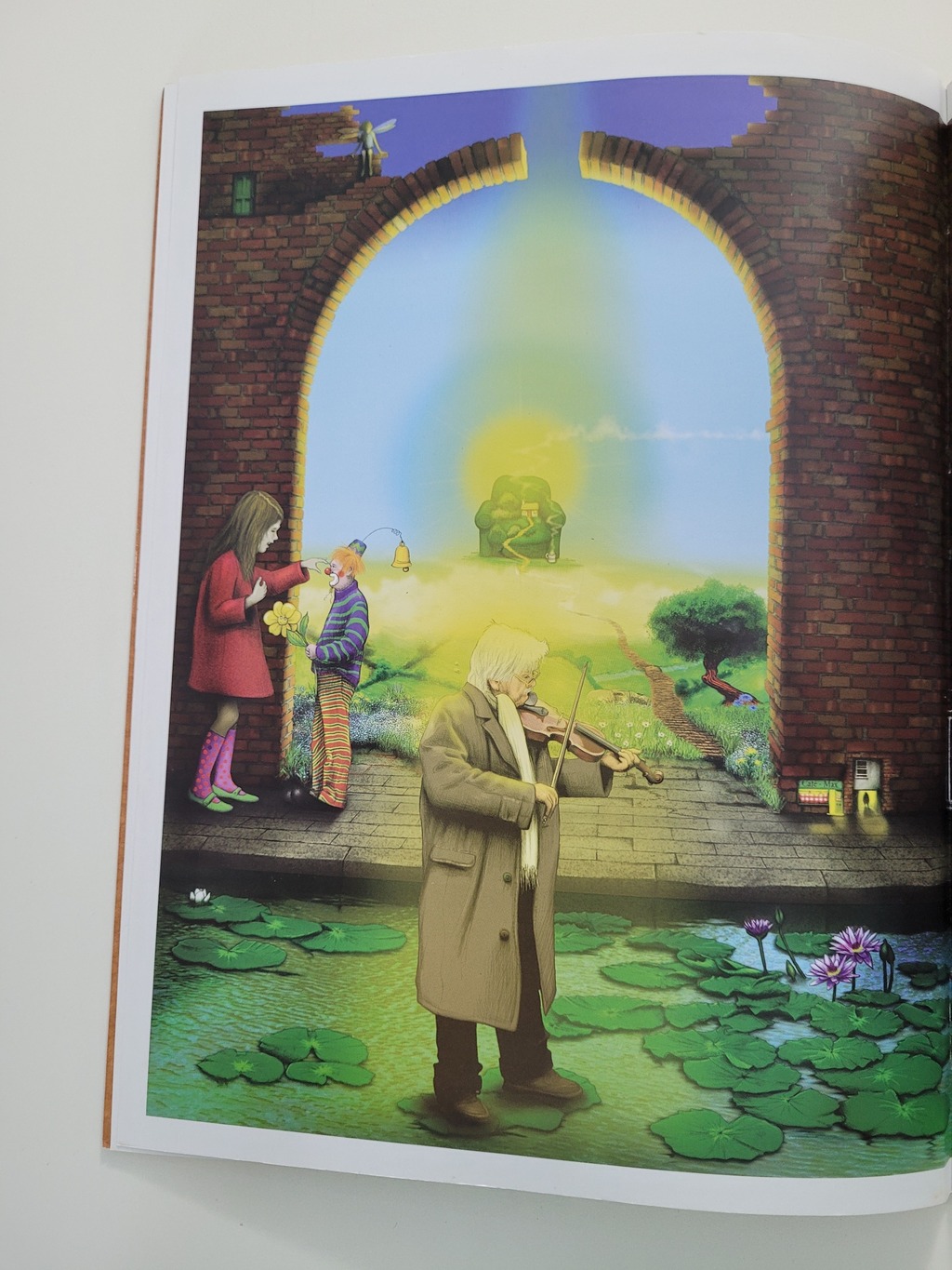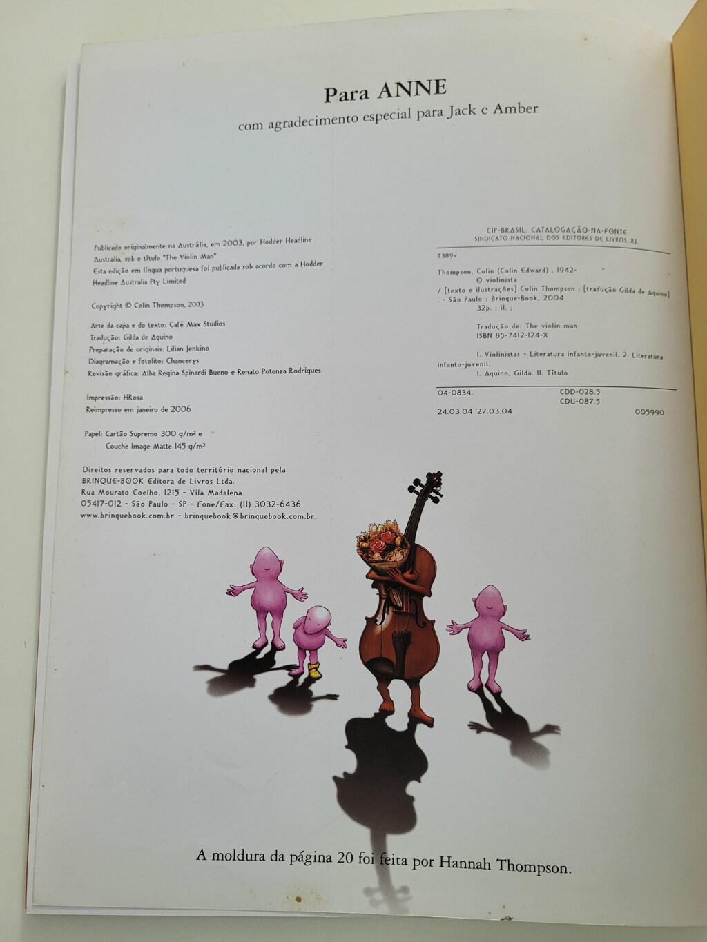Faz muito tempo que Oscar toca seu violino na calçada do teatro. Todas as noites, enquanto as pessoas fazem fila para comprar ingressos, Oscar enche o ar com sua música e com o eco de seus sonhos perdidos. Nesses sonhos, ele é o maior violinista que já existiu, e sua jovem filha, Marieta, que já se foi há muito tempo, é uma grande bailarina. Então, um dia, o sonho de Oscar se realiza… Um belíssimo conto de amor, de perdas e de música do conhecido autor e ilustrador Colin Thompson.