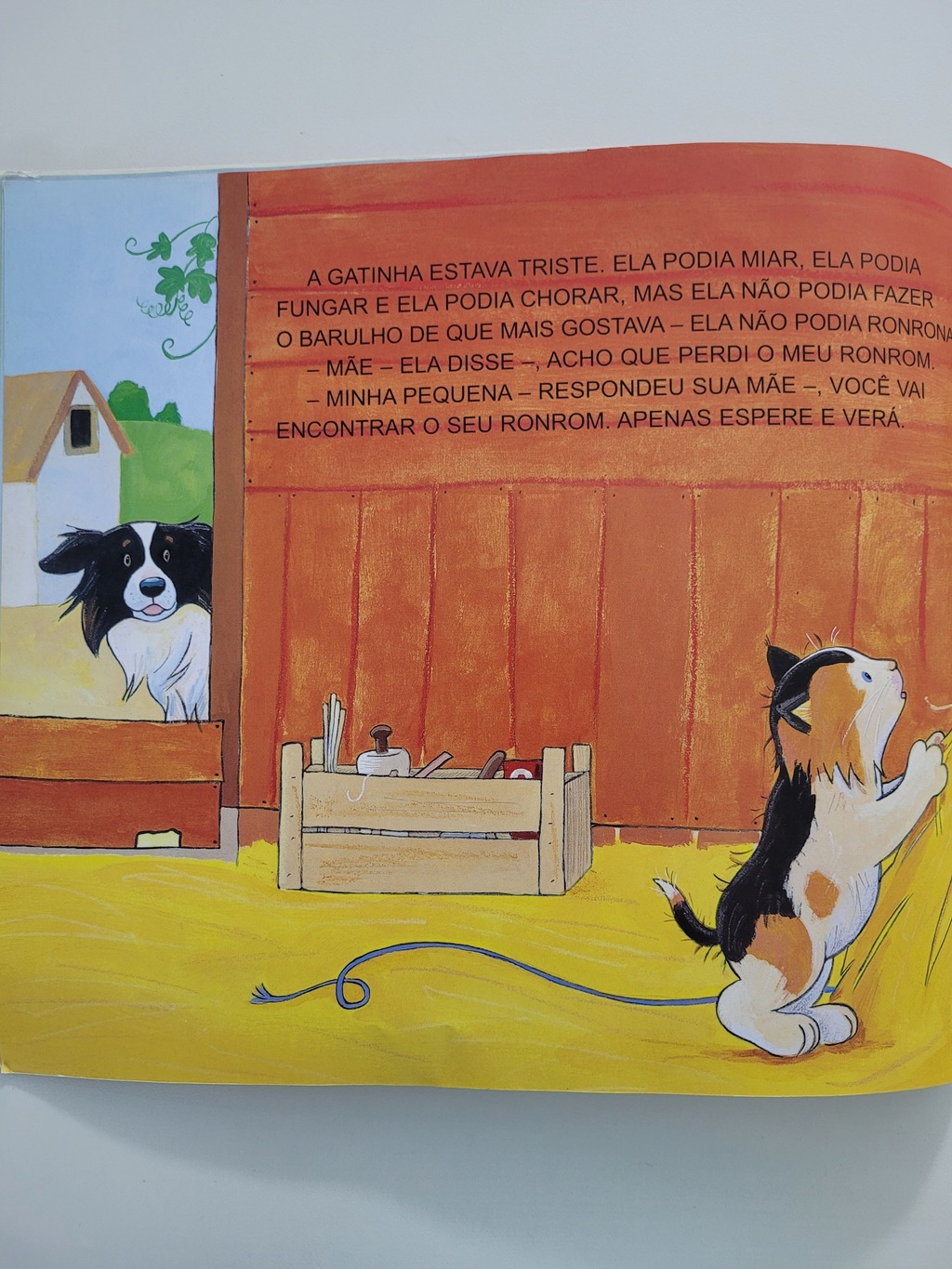 A gatinha sabe que todos os gatos ronronam, então porque ela não pode ronronar também? Em Você pegou o meu ronrom? ela pergunta para a cachorra, mas a cachorra só tem seu latido. Será que a vaca pegou o ronrom dela? Ou a ovelha? Um por um, a gatinha pergunta a todos os animais da fazenda, mas nenhum deles pegou seu ronrom. Onde será que ele pode estar?