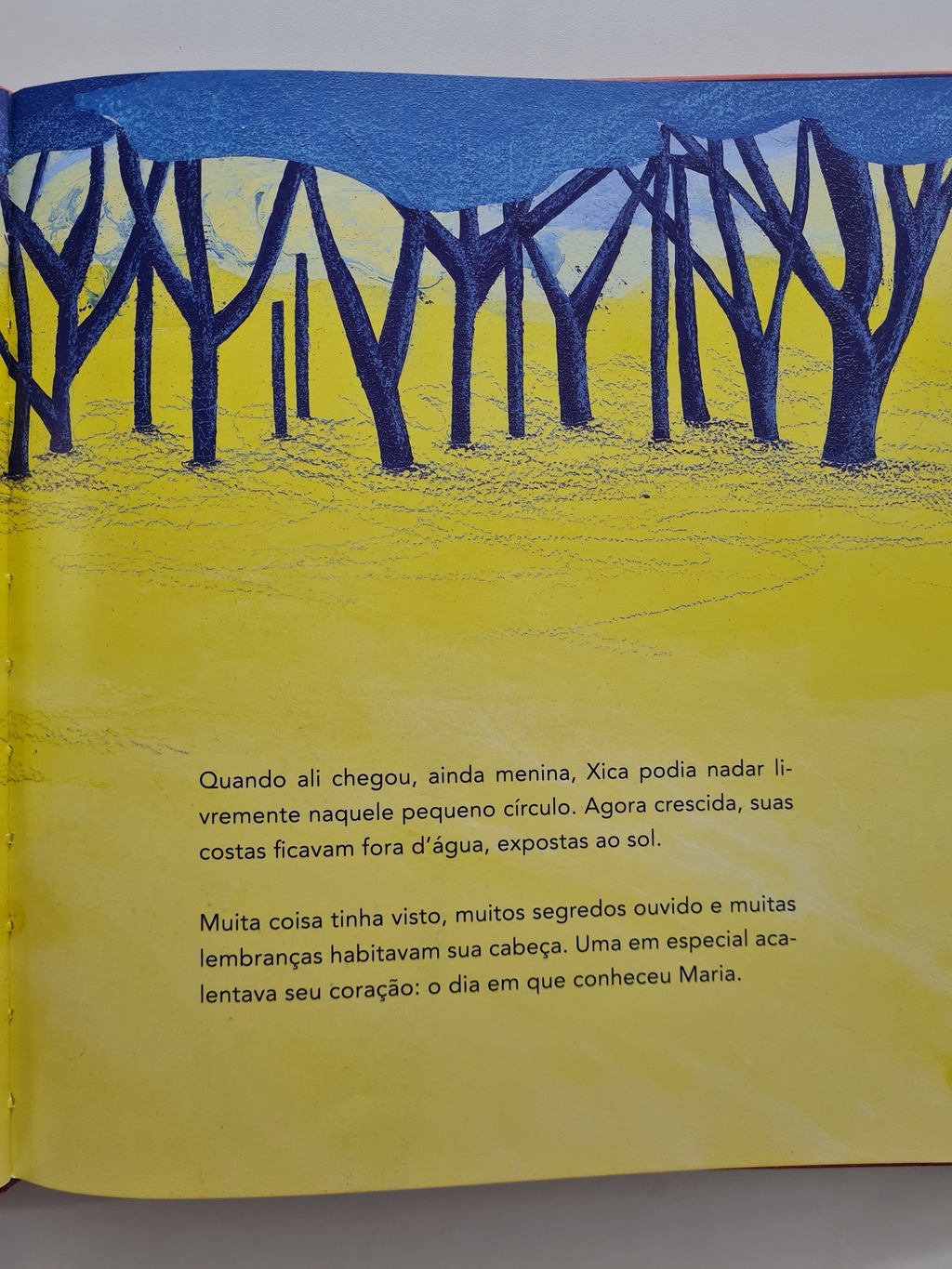 Xica sente um vazio no peito, saudade do cheiro do mar, do gosto do sal e da lua nascendo vermelha no horizonte. Está muito distante de casa, longe das águas infinitas do oceano e das raízes dos mangues.