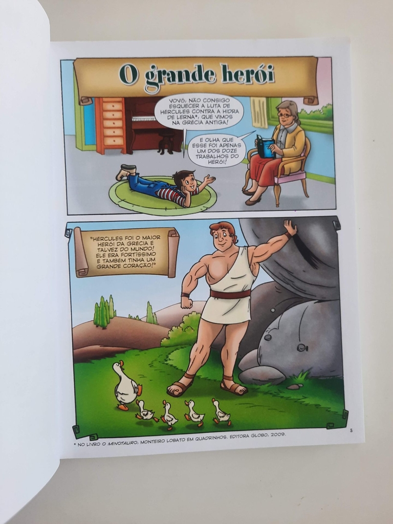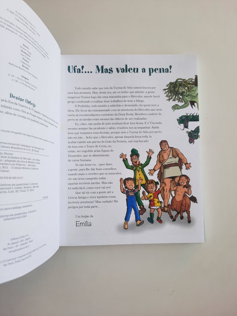 A obra Os doze trabalhos de Hércules, de Monteiro Lobato, segue há seis décadas encantando todas as gerações de crianças. A fascinante mitologia grega filtrada pelo olhar brasileiríssimo da Turma do Sítio do Picapau Amarelo resultou num clássico de nossa literatura infantojuvenil que, agora, é revisitado a bordo da coleção Monteiro Lobato em Quadrinhos, da Globo Livros. Na trama, Pedrinho, Emília e o Visconde de Sabugosa recorrem ao pó de pirlimpimpim para recuar mais de 2 mil anos no tempo, a fim de ajudar Hércules na primeira de sua dúzia de missões impossíveis. E assim, uma a uma, as tarefas do semideus vão sendo cumpridas com o apoio intelectual dos personagens do Sítio, uma vez que o herói grego tem força e valentia, mas carece de alguma esperteza. A adaptação da história original para a dinâmica linguagem das HQs é assinada por Denise Ortega, que tem sucesso ao preservar o humor e a ironia do texto de Lobato. Além da HQ propriamente dita, o livro inclui vários anexos, com comentários sobre a iniciativa de Lobato de recontar o mito de Hércules na série original de doze livros, sobre a mitologia e sobre outros grandes heróis mitológicos e suas façanhas. Isso sem contar o pequeno glossário final, que esclarece o significado de palavras incomuns para o vocabulário dos pequenos leitores.