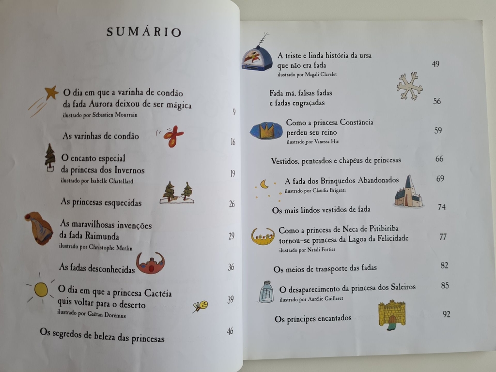 Todo mundo conhece os tradicionais contos de fadas e de princesas, mas alguns segredos dessas famosas personagens nunca tinham sido revelados – até que Didier Lévy decidiu contá-los. Por exemplo: como elas fazem para manter um sorriso sempre lindo? E será que elas sempre preferem aqueles vestidos longos cor-de-rosa, ou algumas gostam mais de vestidos azuis, bem curtinhos? E o que fazem as fadas quando estão com preguiça e não querem saber de feitiços? Entre um conto e outro, o livro traz informações pouco conhecidas, mas preciosas, sobre o mundo dos contos de fadas, como os seus meios de transporte (dragões, unicórnios, e lombos de baleia) e uma classificação dos diferentes estilos de príncipe encantado (príncipe do rock, príncipe musculoso e príncipe nada encantador). Cada conto tem ilustrações de um artista diferente, o que dá ao livro um colorido especial e destaca a atmosfera bem-humorada dos textos.
