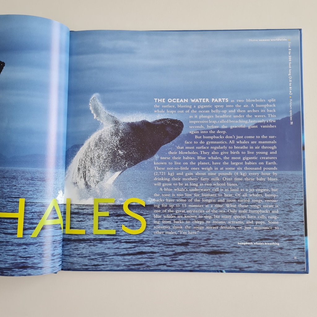 Swim with sharks! Dive with dolphins! Stroll the beach with penguins! Young readers will joyfully immerse themselves in this awesome adventure at sea, in which stunning National Geographic photos reveal hidden worlds of action and beauty. We meet 30 favorite sea creatures and explore their watery homes: playful dolphins, mysterious sharks, graceful sea turtles, waddling penguins, and dozens of others. Kids will marvel at speedy swimmers on the hunt, and smile at cuddly scenes of animal families. To give background on the attention-grabbing photographs, each page is sprinkled with fun facts and layered with information about ocean wildlife and environments. Age-appropriate text tells each animals story in language thats accurate, lively, and non-intimidating. National Geographic maps encourage kids to learn about the geography of land and sea. Conservation tips help readers of all ages understand how we can be kind to the oceans. At home in the classroom and on the family bookshelf, is a trove of thrilling sights and discoveries. Timed to coordinate with the release of Disneys much-anticipated movie on Earth Day 2010, this exciting book taps into and encourages new awareness about the worlds marine environments.