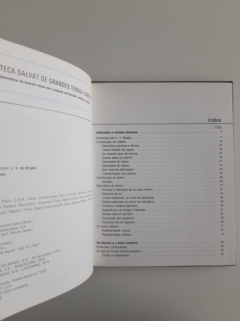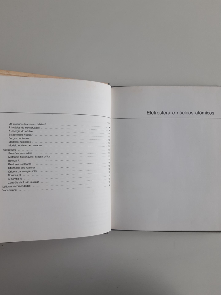 Átomos. Elestrosfera e núcleos atômicos. Constituição da matéria. Elementos químicos. Elétron. Constituição dos átomos. Isótopos. Luz. Primeiros modelos atômicos. Bohr. Espectros. Radioatividade. Átomos e a física moderna. Ondas e corpúsculos. Órbitas. Princípios de conservação. Energia do núcleo. Forças nucleares. Reações em cadeia. Massa crítica. Bomba A. Reatores nucleares. Energia solar. Bomba H. Bomba N. Fusão nuclear.