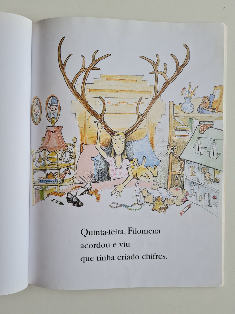 Uma bela quinta-feira, Filomena acorda e constata que lhe cresceram chifres na cabeça. Esse acontecimento estranhíssimo parece não perturbar a menina, mas lhe causa muitos problemas, como dificuldade para se vestir e para passar pela porta do quarto. Os chifres engancham no lustre da sala, e a mãe da garota desmaia quando a vê transformada. O médico não consegue explicar o ocorrido, tampouco o diretor da escola, que a olha com cara de mau. Quem encontra a resposta mais esdrúxula é Nelson, o irmão de Filomena. Ao consultar uma enciclopédia, o menino constata que ela se transformara num tipo raro de alce. A família decide esconder os chifres da garota e contrata um chapeleiro para confeccionar um chapéu sob medida. A menina vai dormir pensando nas novidades daquele dia. E, na manhã seguinte, acorda sem chifres, mas com outra incrível transformação em seu corpo.