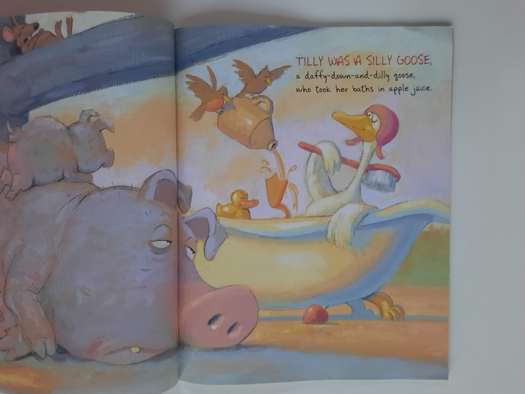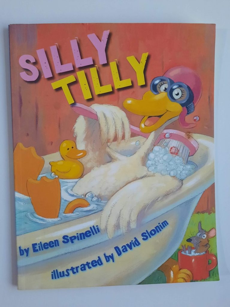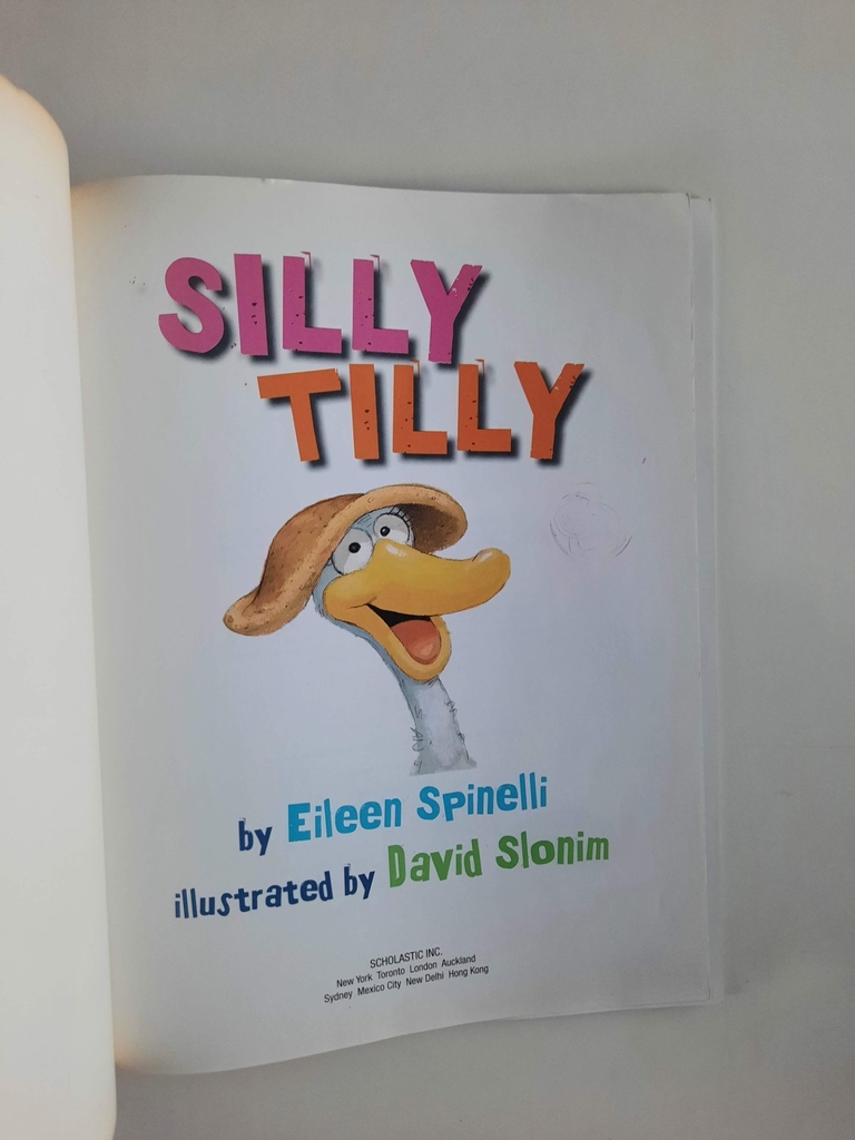 Tilly is not an ordinary goose. She takes her baths in apple juice. She wears a pancake as a hat. She tries to ride the farmers cat.” But the barnyard animals complain that shes too silly. When she stops entertaining her friends with her antics, the farm becomes a quiet and unhappy place. David Slonims acrylic, pencil, and ballpoint pen illustrations add to the hilarity in this story about a one-of-a-kind silly goose.