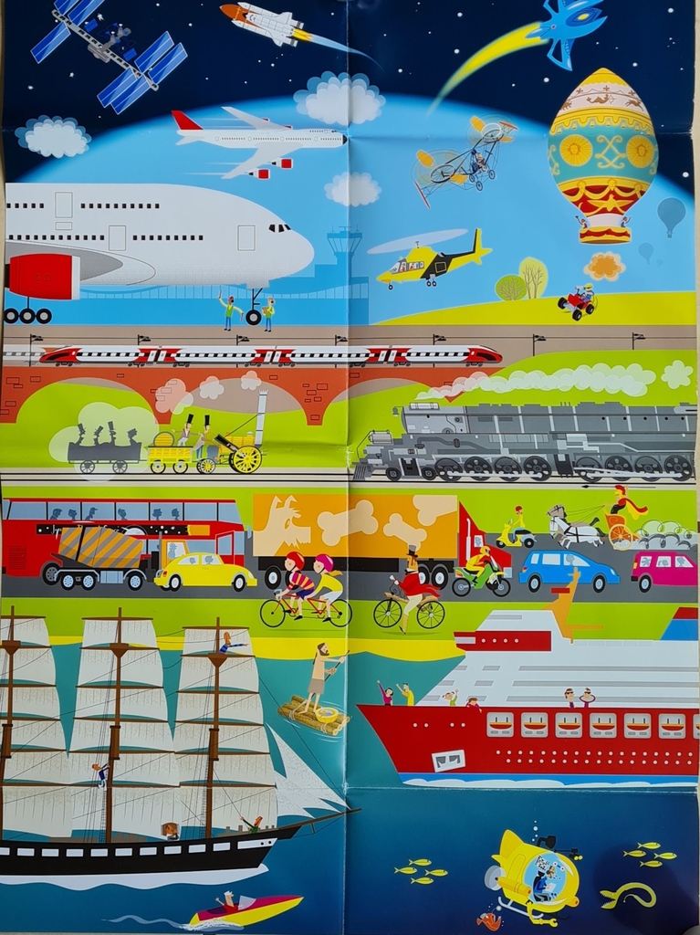 Todos a bordo! Embarque! Nós estamos prontos para partir em uma viagem pelo mundo dos transportes. Vamos descobrir os maravilhosos automóveis, trens, aviões e navios, que nos conduzem pela terra, através do ar e do mar.