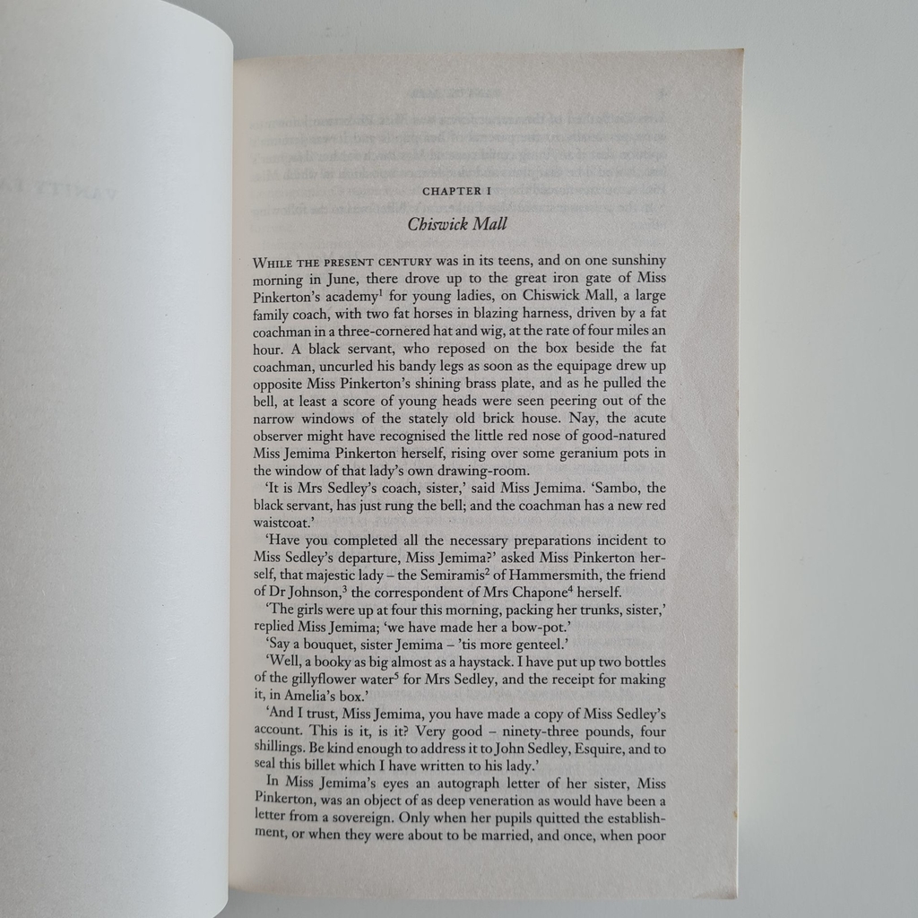 O mundo regencial de classe alta de Thackeray é um parque de diversões comercial barulhento e agitado, predominantemente impulsionado pela ganância aquisitiva e pelo materialismo sem alma, no qual o próprio narrador desempenha um papel brilhantemente versátil como um observador serio-cômico. Embora intitulado A Novel without a Hero, Vanity Fair segue a sorte de duas vidas contrastantes, mas interligadas: através da aposentadoria Amelia Sedley e da brilhante Becky Sharp, Thackeray examina a posição das mulheres em um mundo masculino intensamente explorador. Quando a Vanity Fair foi publicada em 1848, Charlotte Brontë comentou: ‘Quanto mais leio as obras de Thackeray, mais tenho certeza de que ele está sozinho – sozinho em sua sagacidade, sozinho em sua verdade, sozinho em seus sentimentos … Thackeray é um Titã.’